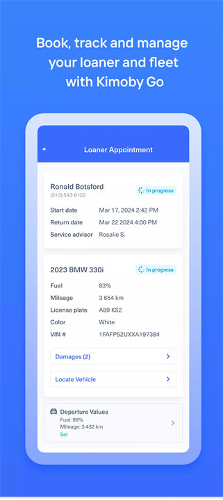 Answer: Through Kimoby Go, dealerships can monitor and manage loaner or fleet vehicle statuses, track their availability, and stay organized with vehicle logistics.