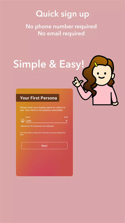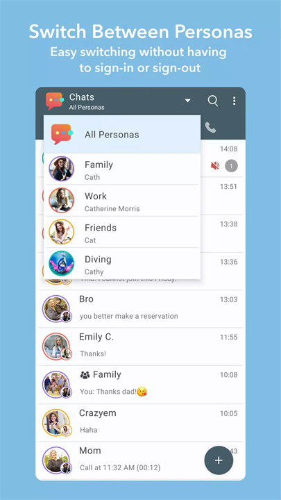 You can switch between different personas easily with just one tap within the app. This allows you to manage different profiles for different relationships seamlessly.
