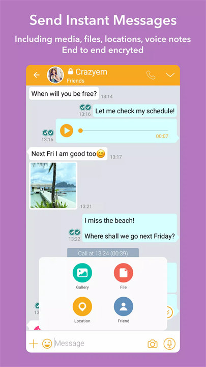 Send text, photos, videos, voice recordings, locations, and other media securely. All communications are encrypted for privacy.