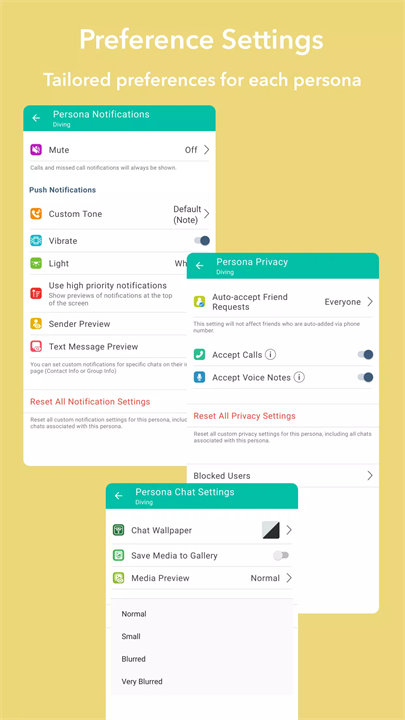 You can set different privacy settings for each persona, controlling what others can see and how they can interact with you. This gives you total control over how you present yourself in various relationships.