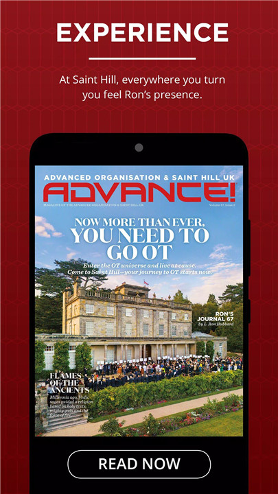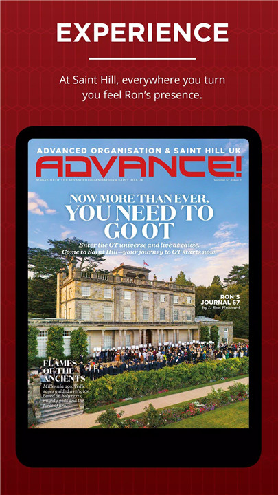 The Advance! magazine app brings the world of Saint Hill, the UK home of L. Ron Hubbard, directly to mobile devices and tablets. Designed for IAS members, the app provides exclusive access to stories, videos, and insights from the Advanced Organisation. Members can experience the spiritual breakthroughs, successes, and teachings of Scientology from Ron’s Home, right from their device.