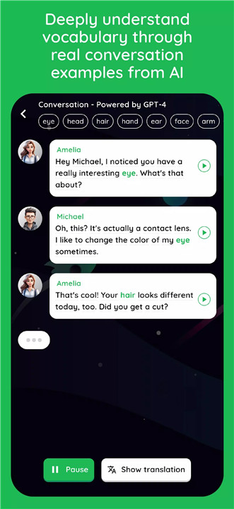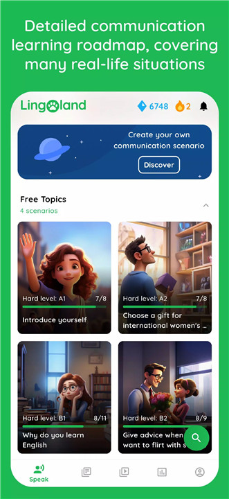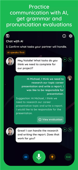 The communication practice feature is designed to build your confidence in real-life English usage. Advanced voice recognition technology provides detailed feedback on your pronunciation, helping you improve clarity and accuracy. Additionally, you can chat with an AI that simulates real-life scenarios like ordering food, job interviews, or casual conversations.