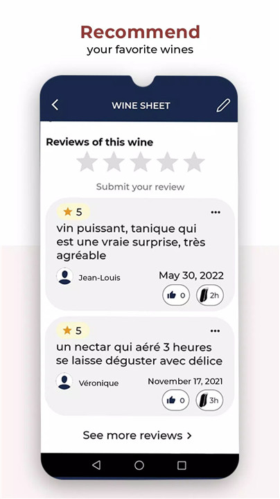 Aveine relies on user participation to expand its wine database. By scanning wines and submitting forms, users contribute to a collective resource that now contains over 10,000 references. If a wine is not already listed, an intelligent algorithm identifies similar wines and provides an aeration recommendation, which can be refined further through user input. Each new entry is manually verified before being added to the database.