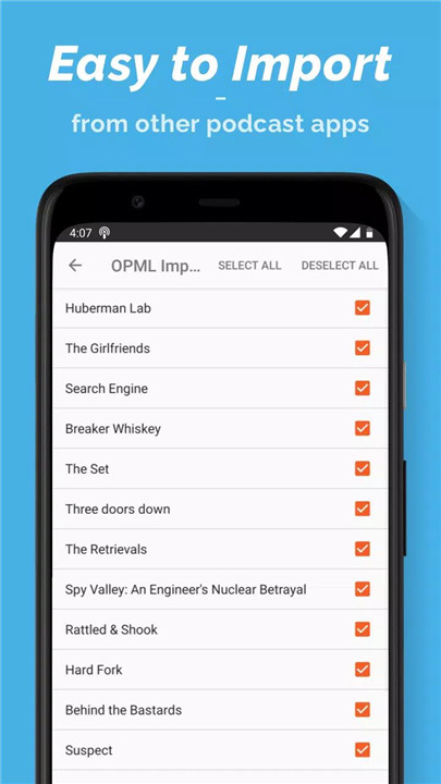 The OPML Import feature allows quick transfer of podcast subscriptions from other apps.