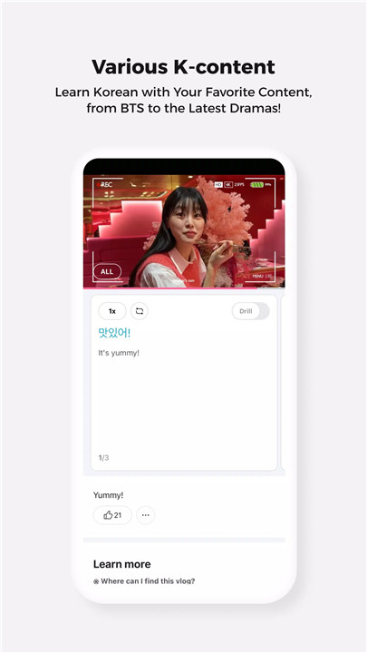 Cake provides a unique learning experience through a variety of video content featuring your favorite celebrities, artists, and vloggers. These videos are not only entertaining but also packed with real English expressions used in everyday life. Our original content is crafted to keep you engaged and motivated.