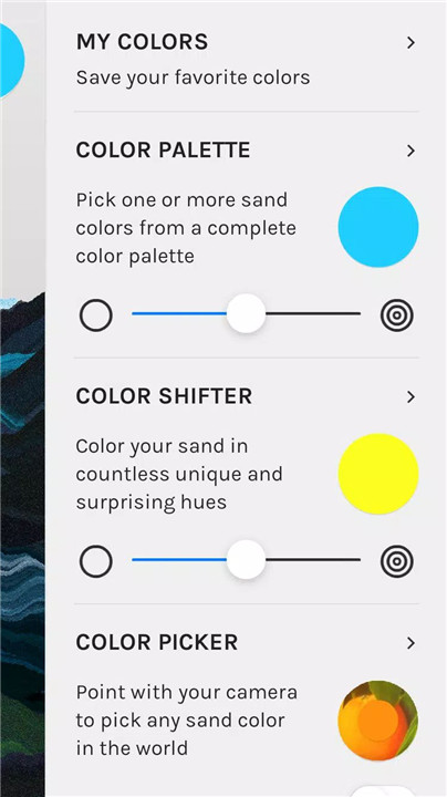 Color Palette lets users choose specific sand colors or mix multiple colors, adjust intensity, and randomize for unexpected combinations.
