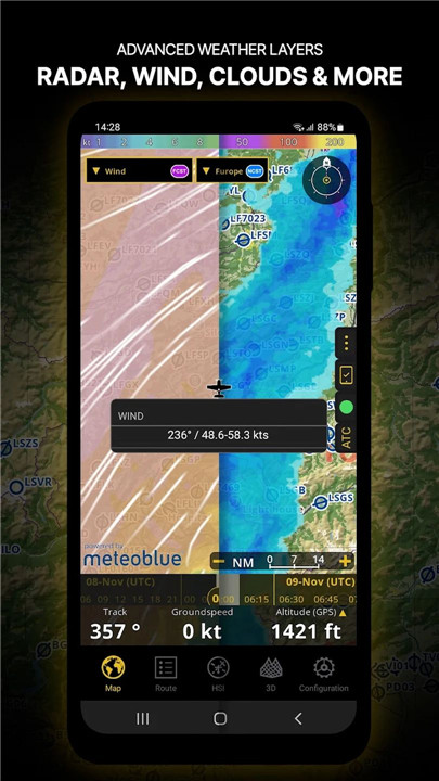Advanced weather layers, including rain radar, wind, clouds, and GAFOR reports, are available for Smart Advanced plan subscribers.