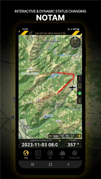 Set the departure time to display NOTAMs relevant for that specific time. Dynamic color coding helps pilots quickly identify active, pending, or expired NOTAMs on the map.
