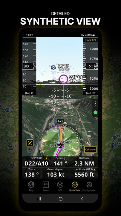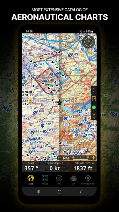 The app provides worldwide aeronautical charts, ICAO charts, and georeferenced approach charts, all available for use on the moving map or synthetic view.