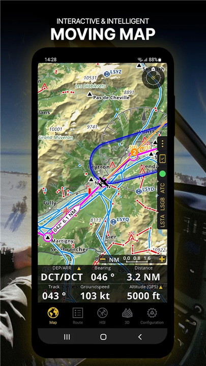 Plan and navigate flights using an interactive moving map with customizable backgrounds, including aeronautical charts, satellite imagery, and vector maps. The map displays waypoints, NOTAMs, airspaces, and obstacles from a constantly updated global aeronautical database. Routes can be created by tapping waypoints directly on the map, while the navigation bar can be personalized to show key data such as altitude, vertical speed, bearing, distance to the next waypoint, and ETA. Departure and arrival procedures can also be displayed for enhanced situational awareness.