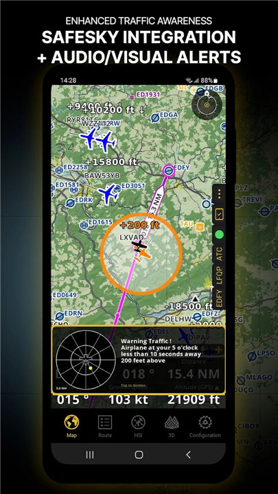 Air Navigation Pro provides visual and audio alerts for nearby traffic in all languages. Pilots can choose traffic icons, including generic, aircraft, or TCAS symbols. Integration with SafeSky ensures access to live traffic data, improving safety during flight. Smart Lite, Smart Classic, and Smart Advanced subscriptions include native SafeSky support, offering a two-in-one solution for traffic awareness.
