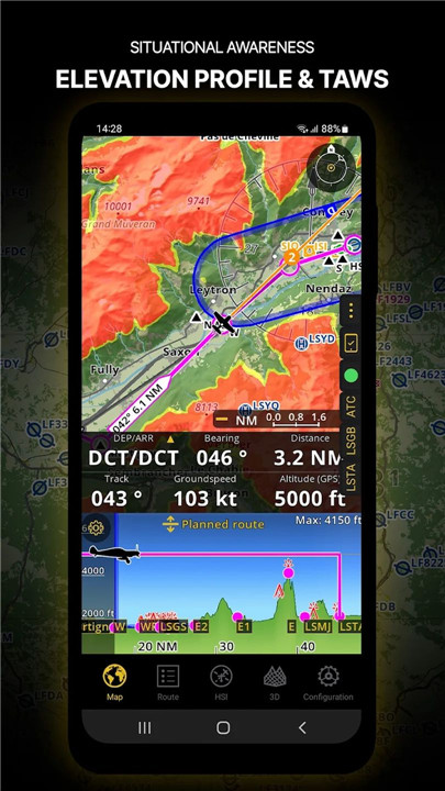 The elevation profile allows pilots to visualize terrain along the route, overlaying airspaces, obstacles, wind, and populated areas. The synthetic view provides additional terrain awareness with an artificial horizon, altitude, and vertical speed indicators. TAWS integration ensures enhanced safety.