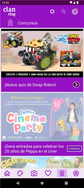 Clan RTVE includes direct access to contests. Children can participate in challenges and win prizes, while parents can access more contest information at www.rtve.es/infantil.