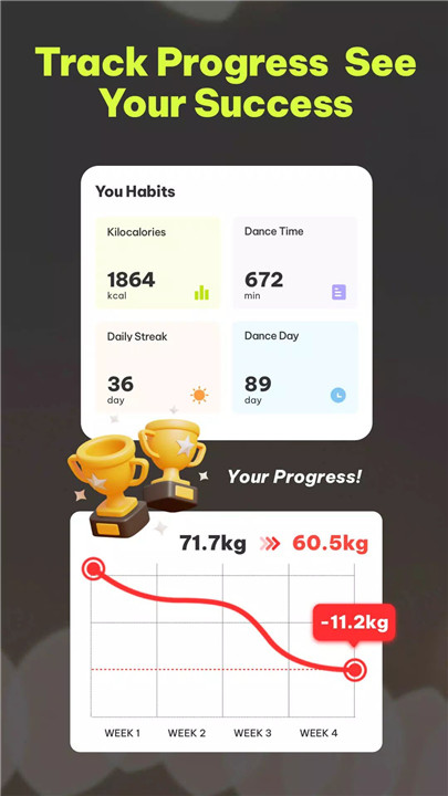 The app automatically tracks calories burned, total practice time, and progress over time. This data helps users stay motivated and provides a clear view of achievements, reinforcing the benefits of consistent dance workouts.