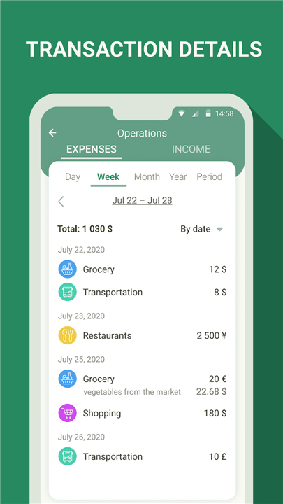 • Gain a profound understanding of your habits with detailed reports that can be sorted by date or amount to reveal exactly where your money goes.