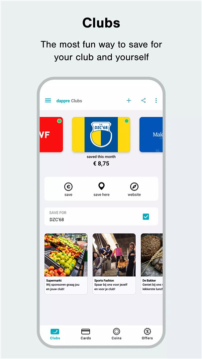 Dappre Clubs allows you to save euros automatically for yourself and for foundations, charities, sports clubs, arts organizations, or neighborhood associations. After choosing your Digital Club Card, your spending at participating entrepreneurs results in instant savings that benefit both you and the club.