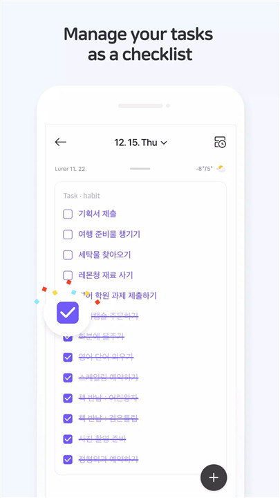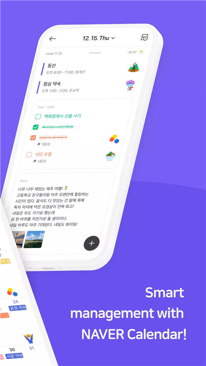 NAVER Calendar manages daily life efficiently, including schedules, tasks, anniversaries, habits, and diary entries. Lunar calendar anniversaries are tracked automatically, and routines can be reinforced with habit management, while personal thoughts are easily recorded in the diary feature.
