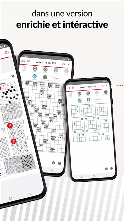 The app provides crosswords, arrow words, and sudoku in interactive formats, along with videos and clickable links from the digital newspaper.