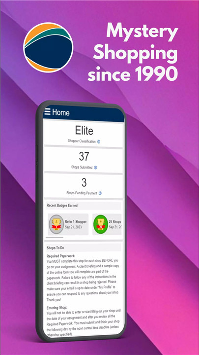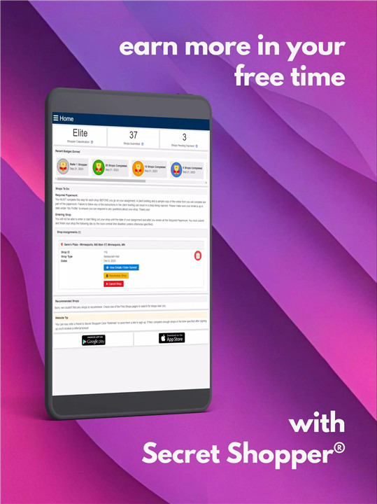 Available on mobile, the app gives users instant access to available assignments, shop instructions, navigation tools, and report submission features—streamlining the entire shopping process in one convenient location.