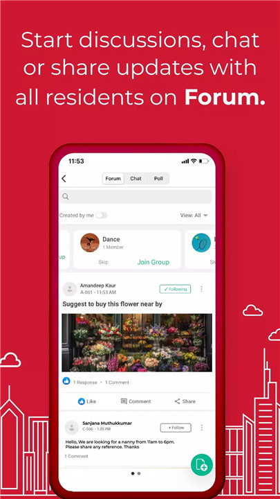 Community engagement is enhanced through discussion forums, group chats, and digital notice boards. A built-in marketplace enables access to services and products, while the digital help desk allows residents to raise complaints and track resolution through tickets.
