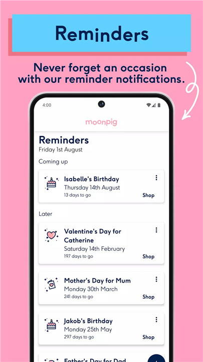 Never miss a special occasion with Moonpig’s built-in birthday reminders. Set alerts so you’re nudged ahead of time, ensuring you’ve got the perfect card ready for your loved one. Plus, app users get access to exclusive offers, making it even easier to send thoughtful gifts and cards year-round.