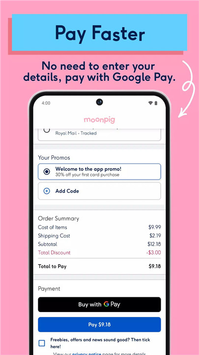 Moonpig accepts Google Pay, debit, and credit cards for a secure and easy checkout experience.