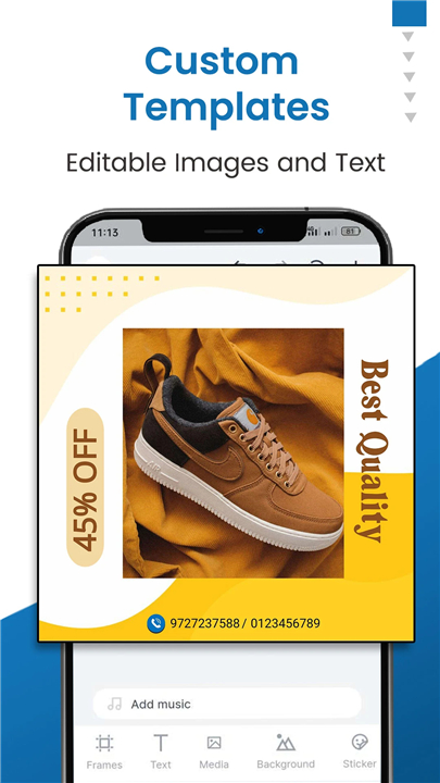 A: Personalization is seamless. Once you register and upload your business details like your logo, contact information, and website, the app automatically incorporates these elements into your chosen templates. You can also select specific frames that match your brand’s color palette and overall style.