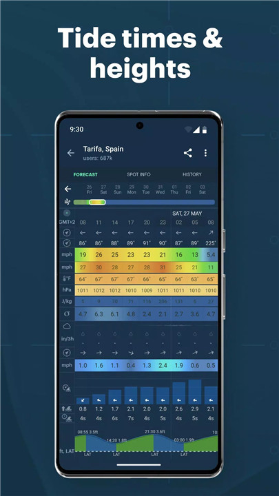 Find and favorite from over 30,000 spots worldwide, sorted by type and location. Join community chats, share local wind conditions, or even become a spot leader.