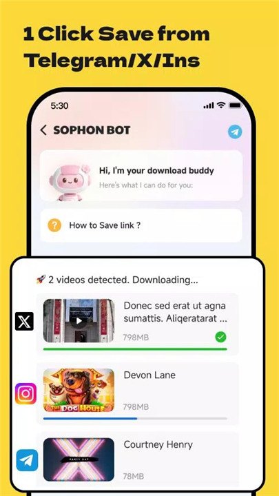 The built-in download bot supports multiple links from platforms like Telegram, X (Twitter), TikTok, Facebook, and more. Simply input the link, and SoPhon handles the download and storage automatically.