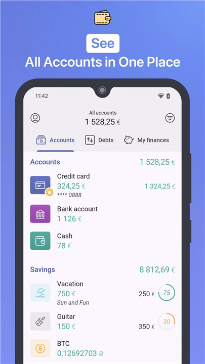 1Money helps manage debts and savings by showing account balances and tracking progress toward financial targets. Whether it’s paying off loans or building an emergency fund, the app provides clear insights to reach goals efficiently.
