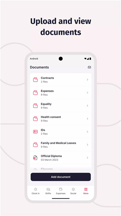 Critical documents can be securely accessed, uploaded, reviewed, and signed within the app. This ensures compliance, reduces paperwork, and keeps all employee records organized and protected.