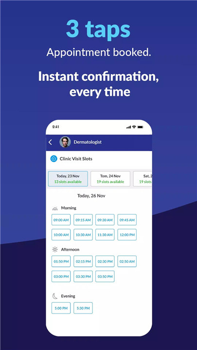 Search for a doctor by name, specialty, or clinic, check their profile and reviews, and book an appointment directly through the app.