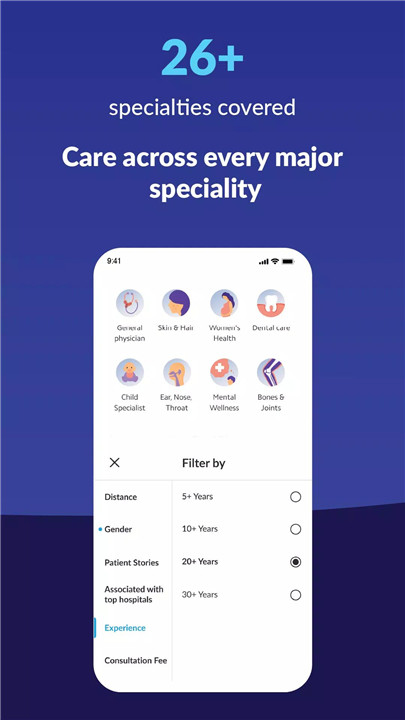 Practo allows patients to explore treatments based on symptoms and select the right specialist accordingly. Top specialties include: