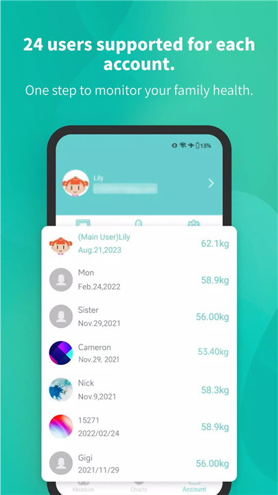 Fitdays supports up to 24 users within one account, making it perfect for families or fitness groups. Track and compare the health data of multiple members, all in one convenient app.