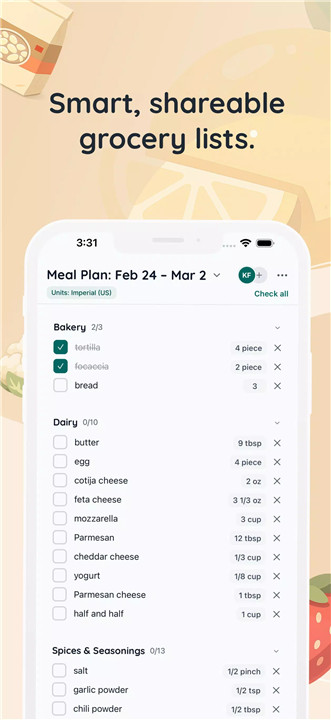 Kitcha simplifies grocery shopping by generating lists directly from selected recipes or full meal plans. Items are automatically grouped by category or store aisle, helping streamline the shopping process. Lists can be shared with multiple users, allowing family members or housemates to collaborate, add items, and track progress in real time.
