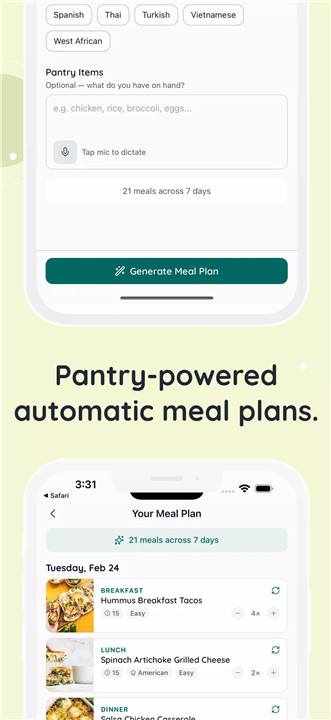 Meal planning is designed to adapt to different routines and preferences. Plans can include multiple meals per day, from breakfast to snacks, and can be adjusted at any time. Users can reuse previous meal plans or quickly swap dishes as needed. Premium features also allow for automatic weekly plan generation based on pantry items and dietary preferences, reducing the effort required to plan ahead.