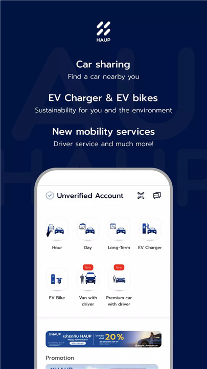 Discover the future of mobility with HAUP, Thailand’s leading all-in-one car-sharing platform. Designed to simplify your travel experience, the HAUP app allows you to unlock vehicles instantly, book rides flexibly, and choose from a variety of eco-friendly options—all tailored to suit your lifestyle and travel needs. With HAUP, life is a road—own it your way.