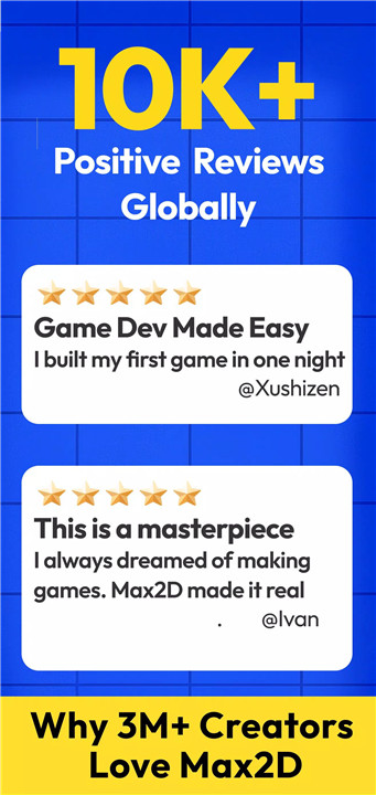 Max2D is a powerful mobile game development app that enables the creation, sharing, and discovery of games directly from a smartphone or tablet. Used by millions of people worldwide, Max2D makes game development accessible to everyone, allowing ideas to transform into playable games without requiring programming knowledge.