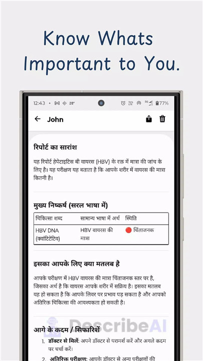 Beyond terminology, DescribeAI provides personalized health insights. The app interprets lab results, vital signs, and medical conditions, offering actionable guidance and highlighting potential areas of concern, supporting better healthcare management.