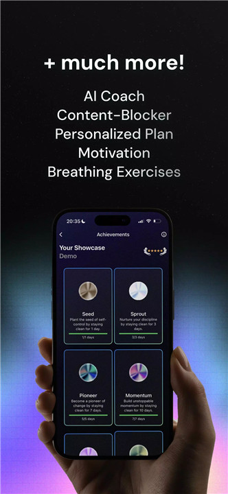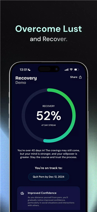 The app features a structured, 90-day recovery program that combines interactive challenges, meditation exercises, and goal-setting tools. Each day presents targeted exercises to strengthen self-control, build discipline, and foster a sense of achievement, helping users make measurable progress toward recovery.