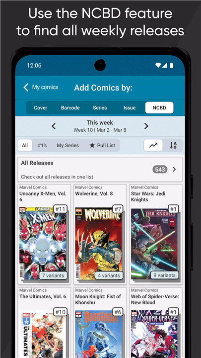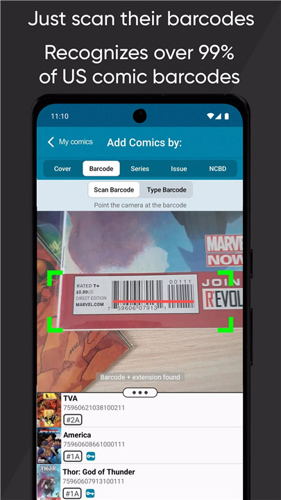 Comics can be added by scanning covers, scanning barcodes, selecting issues from a series list, or searching by title and issue number.