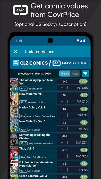 Comic values are optional and available through a separate CovrPrice subscription.
