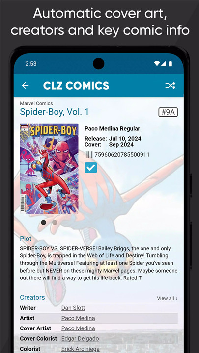 The CLZ Core comic database automatically provides complete issue data, including series name, issue number, publisher, plot descriptions, creator and character lists, backdrop art, and key comic information such as first appearances. High-quality cover art is added instantly.