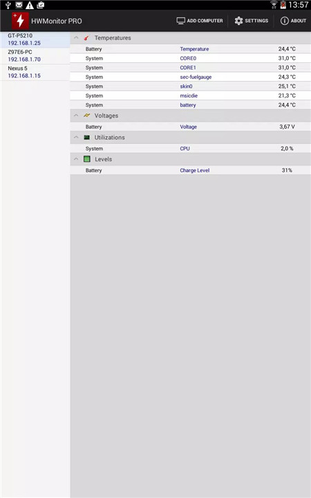 HWMonitor PRO tracks a wide range of device parameters in real time. Depending on the device, it can display temperatures for CPU cores, battery, and other system components. Additionally, it monitors CPU usage and battery information including voltage, temperature, and charge level.