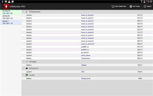 The app goes beyond local monitoring by enabling data sharing over a local network. Users can display monitoring data on a Windows PC running HWMonitor PRO or on another Android device. HWMonitor PRO also allows users to manage up to 10 systems simultaneously, providing a centralized platform to monitor multiple devices in real time.