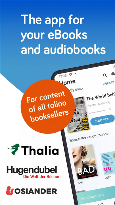 The tolino app unites multiple renowned booksellers into one seamless digital library, offering a flexible and convenient way to enjoy eBooks and audiobooks. With a single app, content purchased from tolino partners such as Thalia, Hugendubel, buecher.de, ebook.de, Osiander, Orell Füssli, and participating meineBUCHhandlung bookstores appears automatically in one central library.