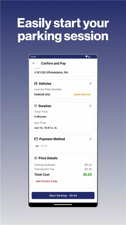 No more trips to the meter. Just enter the zone number posted near your parking space, select your duration, and tap “Start Parking.” It’s fast, secure, and reliable.