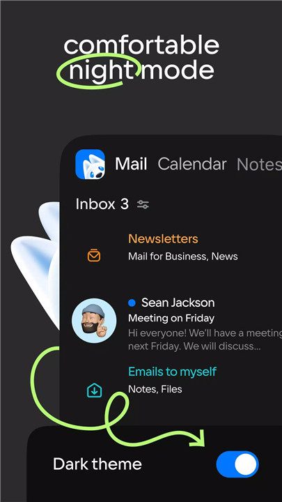 Notifications can be tailored by folder and time preferences, ensuring only relevant messages trigger alerts. A dark mode reduces eye strain during night usage, while a bright mode provides clarity during the day.