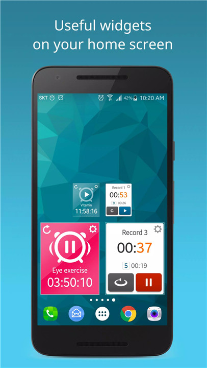Customize your home screen with clean, color-coded widgets that display active timers. Widgets are resizable and designed to complement both light and dark themes, making timer tracking easy at a glance.