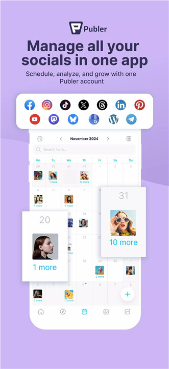 Publer allows the management of all major social platforms in one place, including Facebook, Instagram, Threads App, TikTok, LinkedIn, Twitter/X, Mastodon, Bluesky, Pinterest, YouTube, Google Business, Telegram, and WordPress.